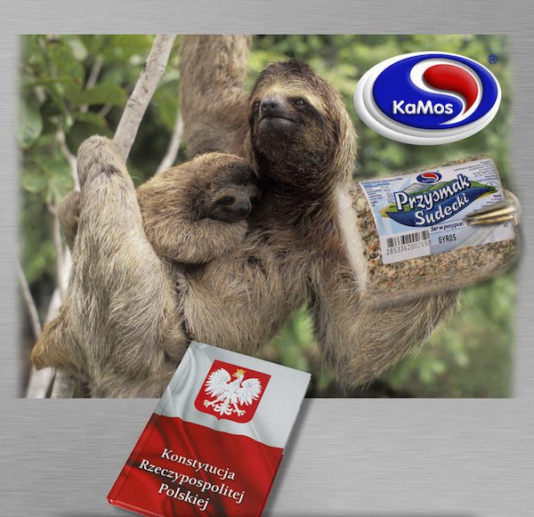 Maj to miesiąc hit. Mama leniwiec uwieszona na gałęzi z przysmakiem sudeckim w szponach. Na jej brzuchu młody zapatrzony w polską konstytucję. Grafika ściśle współgra z obchodzonymi świętami: dniem konstytucji 3 maja, dniem matki, ale jest też święto pracy i flagi, wniebowstąpienie i niedziela handlowa.