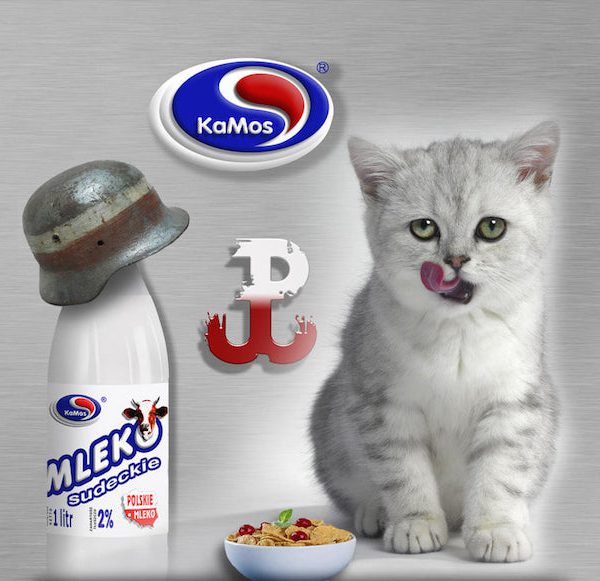 W sierpniu także hit! Mały kot z falującym językiem nad miską musli uświetnia miesiąc mleka. Obok stoi butelka firmowego mleka ubrana w powstańczy hełm z polską flagą i dziurami po kulach. Pomiędzy znak powstańców warszawskich. Inne odznaczone święta: wojska polskiego, dzień solidarności i wolności oaz niedziela handlowa.